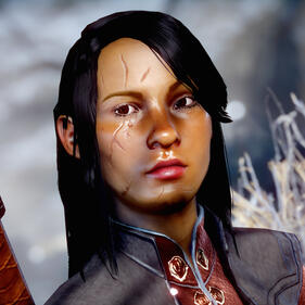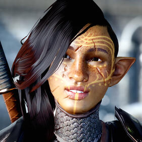 Tala was born in Seheron to Clan Bahaghari. Due to the danger of Tevinter slavers, her clan lived with the Fog Warriors until the time they finally decided to leave Seheron for the Free Marches. Once arriving in the Free Marches, Clan Bahaghari meets with Clan Lavellan and decides to merge their clans together.Tala developed magic early in her childhood. Her skills and powers were honed by Deshanna and her parents. Tala was excited to eventually take on the role of Keeper. In her teens, she was often mischievous, running off and pulling pranks on hunters alongside her friend Ethriel. Tala always sought out to befriend everyone, and was well-known in the clan. However, when her first love Valythari decides not to continue their bonding ceremony, Tala is heartbroken. This causes deep insecurities to bubble back up to the surface. When Deshanna gives her to option to spy at the Conclave, she takes and swears off ever finding true love.Personality: